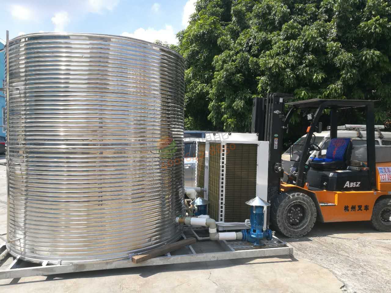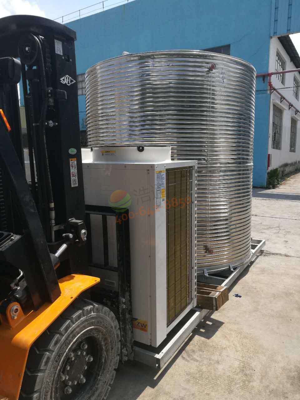 浩通能空氣能熱泵主機KFRS-33II(10P)1臺,配8.5噸不銹鋼保溫水箱1個及相關配套設施,為浩通能空氣能整體式熱水器設備一套