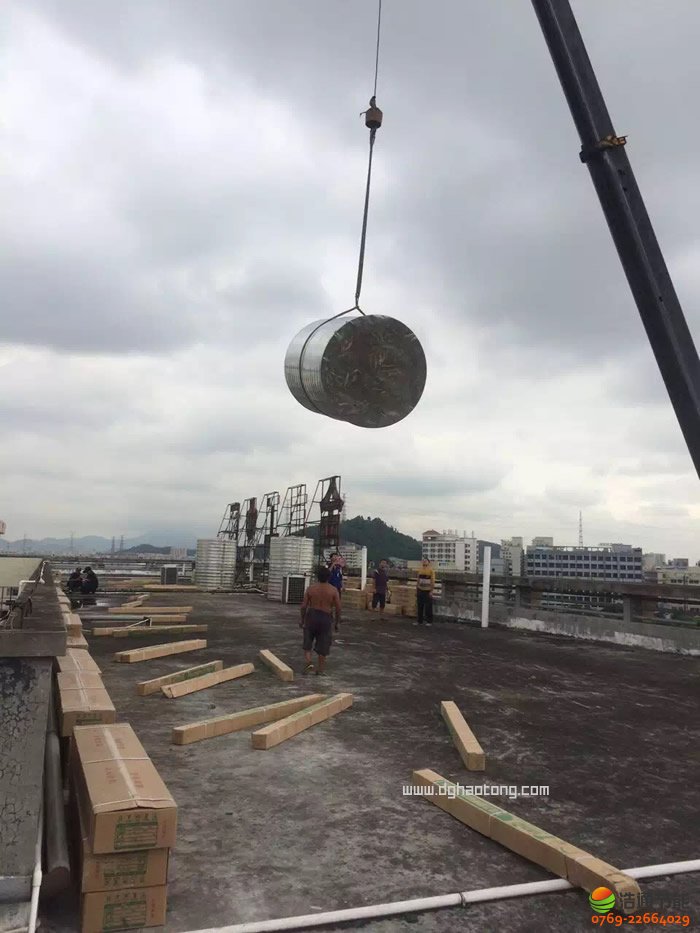 虎門速爾物流1000多人宿舍40噸太陽能+空氣能熱泵熱水工程項目-水箱起吊現(xiàn)場
